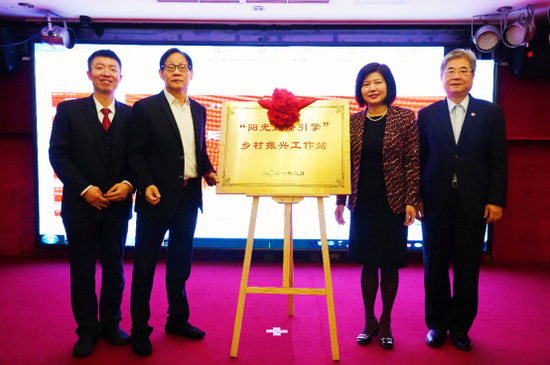 19日上午,乡村振兴产学联盟理事会第一次会议在福州铭濠酒店举行。会上,阳光控股集团执行总裁林冰,福建省海峡传统文化研究院院长何宜健,阳光学院校长乔海曙,阳光控股高教党工委常务副书记陈少平共同为“阳光直播引擎”乡村振兴工作站揭牌,希望借助阳光学院直播产业的人才智力优势,点燃乡村振兴新引擎。