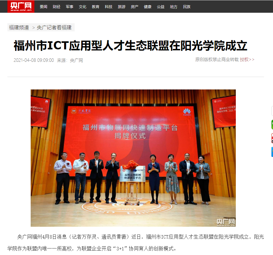 央广网福州4月8日消息(记者万存灵 通讯员黄薇)近日,福州市ICT应用型人才生态联盟在阳光学院成立,阳光学院作为联盟内唯一一所高校,为联盟企业开启“3+1”协同育人的创新模式。