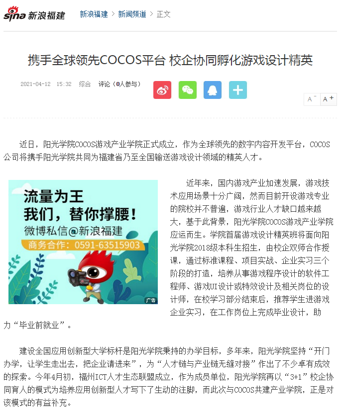 建设全国应用创新型大学标杆是阳光学院秉持的办学目标,多年来,阳光学院坚持“开门办学,让学生走出去,把企业请进来”,为“人才链与产业链无缝对接”作出了不少卓有成效的探索。今年4月初,福州ICT人才生态联盟成立,作为成员单位,阳光学院再以“3+1”校企协同育人的模式为培养应用创新型人才写下了生动的注脚,而此次与COCOS共建产业学院,正是对该模式的有益补充。