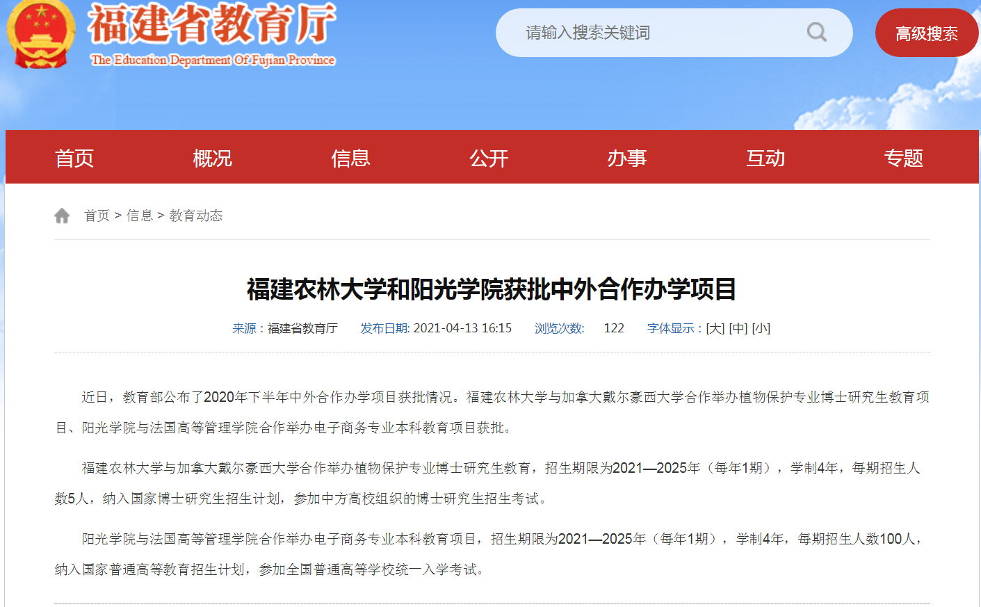 近日,教育部公布了2020年下半年中外合作办学项目获批情况。福建农林大学与加拿大戴尔豪西大学合作举办植物保护专业博士研究生教育项目、阳光学院与法国高等管理学院合作举办电子商务专业本科教育项目获批。