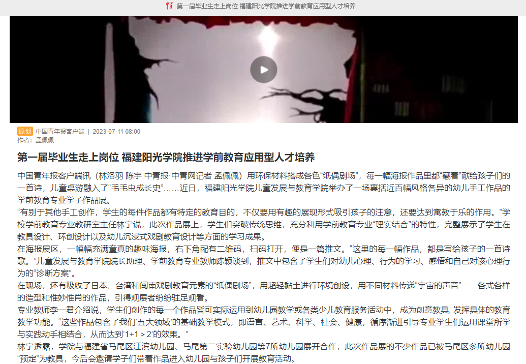 中国青年报客户端讯(林洛羽 陈宇 中青报·中青网记者 孟佩佩)用环保材料搭成各色“纸偶剧场”,每一幅海报作品里都“藏着”献给孩子们的一首诗,儿童桌游融入了“毛毛虫成长史”……近日,福建阳光学院儿童发展与教育学院举办了一场囊括近百幅风格各异的幼儿手工作品的学前教育专业学子作品展。 “有别于其他手工创作,学生的每件作品都有特定的教育目的,不仅要用有趣的展现形式吸引孩子的注意,还要达到寓教于乐的作用。”学校学前教育专业教研室主任林宁说,此次作品展上,学生们突破传统思维,充分利用学前教育专业“理实结合”的特性,完整展示了学生在教具设计、环创设计以及幼儿沉浸式戏剧教育设计等方面的学习成果。 在海报展区,一幅幅充满童真的趣味海报,右下角配有二维码,扫码打开,便是一篇推文。“这里的每一幅作品,都是写给孩子的一首诗歌。”儿童发展与教育学院院长助理、学前教育专业教师陈颖谈到,推文中包含了学生们对幼儿心理、行为的学习、感悟和自己对该心理行为的“诊断方案”。 在现场,还有吸收了日本、台湾和闽南戏剧教育元素的“纸偶剧场”,用超轻黏土进行环境创设,用不同材料传递“宇宙的声音”……各式各样的造型和惟妙惟肖的作品,引得观展者纷纷驻足观看。 专业教师李一君介绍说,学生们创作的每一个作品皆可实际运用到幼儿园教学或各类少儿教育服务活动中,成为创意教具, 发挥具体的教育教学功能。“这些作品包含了我们‘五大领域’的基础教学模式,即语言、艺术、科学、社会、健康,循序渐进引导专业学生们运用课堂所学与实践动手相结合,从而达到‘1+1>2’的效果。” 林宁透露,学院与福建省马尾区江滨幼儿园、马尾第二实验幼儿园等7所幼儿园展开合作,此次作品展的不少作品已被马尾区多所幼儿园“预定”为教具,今后会邀请学子们带着作品进入幼儿园与孩子们开展教育活动。 如何培养真正的应用型人才?儿童发展与教育学院院长林丽卿教授说,学院通过不断创新和打磨人才培养方案,将专业“实战”锻炼贯穿于大学四年全过程,在实践中形成了“进阶式”人才培养模式。“学生入学第一年小学期就会‘入园’进行实训,了解孩子们真实的幼儿园学习生活;大二开始,结合我们的课程内容,学生将每周到幼儿园实践;大三期间,学生会有一周的完整时间,在幼儿园开始独立负责教学活动,还可以把自己的作品带入幼儿园进行汇演;到了大四则有三个月时间进行跟岗和顶岗实习,学生的实战会根据专业知识的深入学习而层层递进。” 据悉,阳光学院学前教育专业今年迎来了第一届毕业生,截至目前,该专业近50名毕业生已考取省内外公立幼儿园教师编制。 (视频:陈天博 陈煜臻)