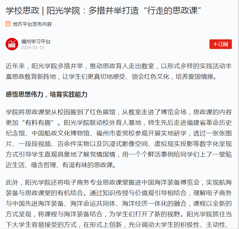 近年来,阳光学院多措并举,推动思政育人走出教室,以形式多样的实践活动丰富思政教育新阵地,让学生们更真切地感受、领会红色文化,培养爱国情操。